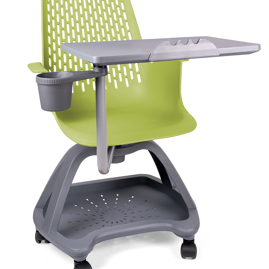 Pupitre escolar respaldo multiperforado y asiento en polipropileno AZUL base circular porta libros GRIS, paleta sin abatimiento