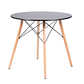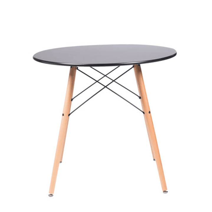 Mesa circular fabricada a partir de MDF con Melamina y acabado brillante, patas de madera y soportes metálicos para ofrecer mayor resistencia.
