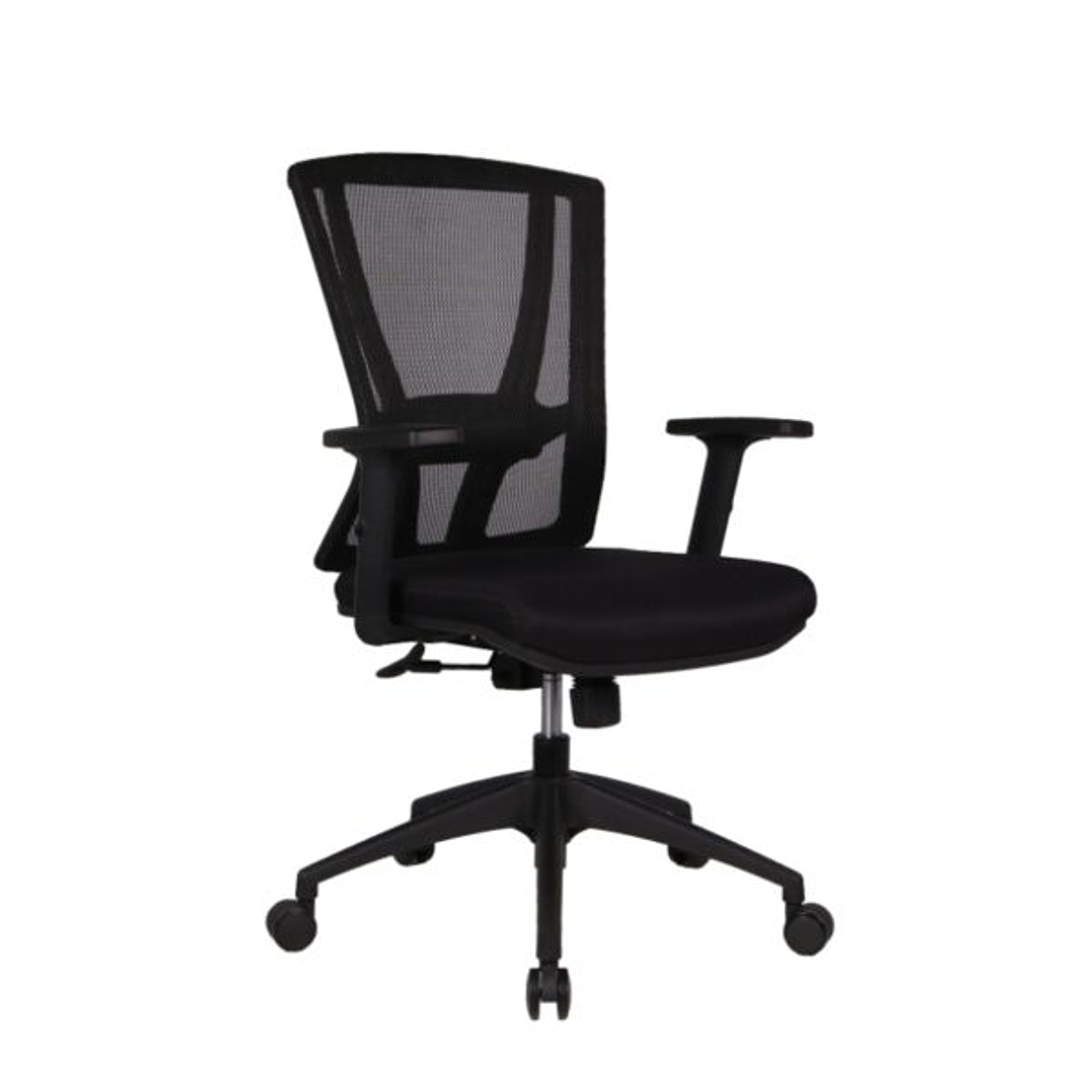RESPALDO TAPIZADO EN MALLA , RESPALDO CON SOPORTE LUMBAR Y AJUSTE DE PROFUNDIDAD, BRAZOS DE POLIPROPILENO CON AJUSTE DE ALTURA Y PAD DE POLIURETANO INYECTADO, ASIENTO GRANDE DE HULE ESPUMA DE 24kg/m3 TAPIZADO EN TELA IMPORT COLOR NEGRO, BASE DE NYLON REFORZADO DE Ø27” CON RODAJAS TIPO DUAL.