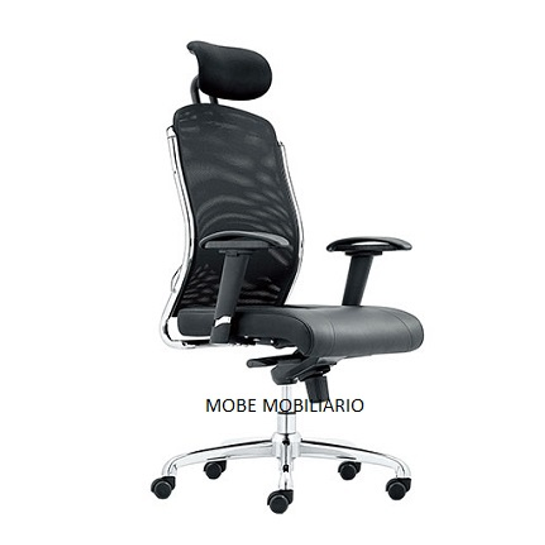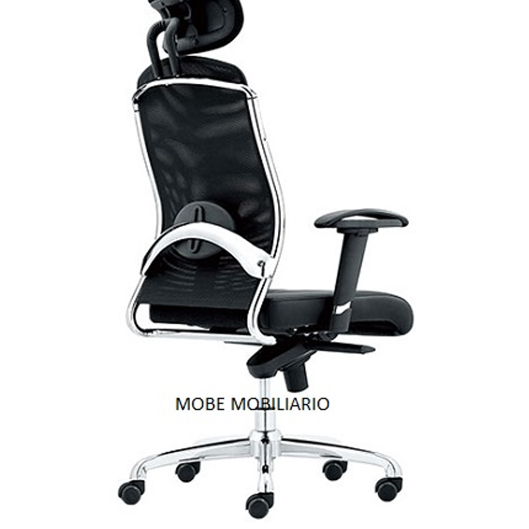 Respaldo en malla de diseño ergonómico con cabecera acojinada y tapizada.