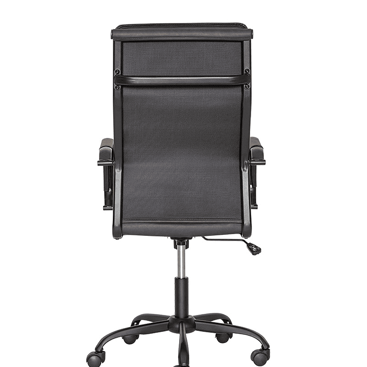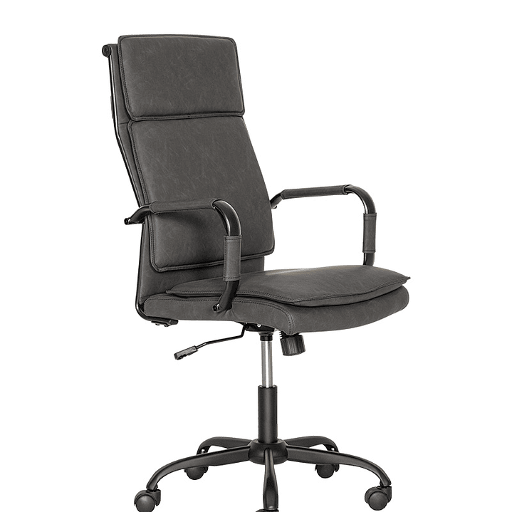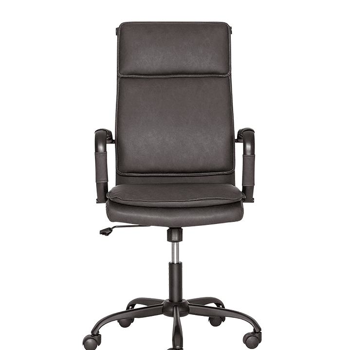 Marco en respaldo, tubular de acero planchado de 1” cal. 18, doblado en forma ergonómica, travesaños para fijar herraje en tubo planchado de 1” cal. 18 pintado, manerala en la parte posterior para mover el sillón en tubular 1” cal. 18, en color negro, respaldo en tapiz tensada con acojinamiento de vinil en color chocolate, gris o café, asiento tapizado en vinil color chocolate, gris o café y con triplay en el interior de 1.2 mm de grosor, hule espuma con densidad 50g/m3, brazos en tubular de acero eliptico de 1¼” cal. 18, negros, con funda en vinil color chocolate, gris , pistón ejecutivo en negro, base metálica en color negro matte de 24”, mecanismo ejecutivo, sistema reclinable, mecanismo de bloqueo y ajuste neumático de altura.