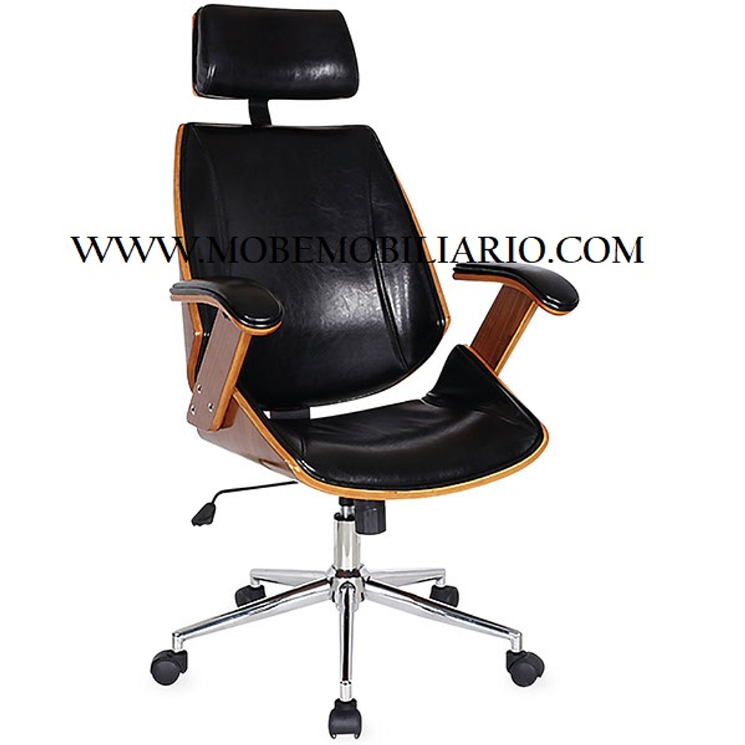 Silla de madera termo formada, tapizada en imitación piel y base de metal cromado.