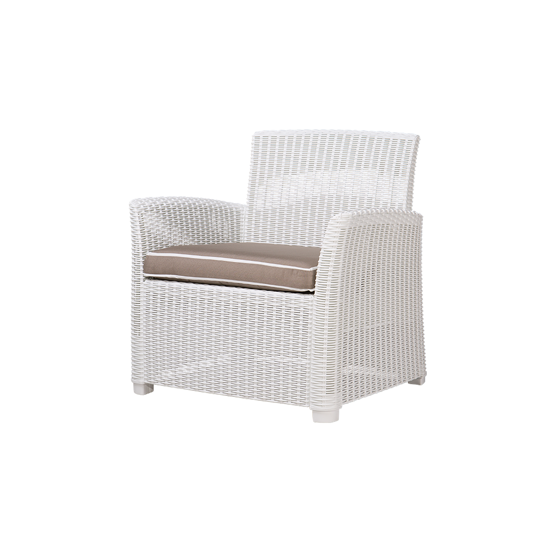 Sillon en polipropileno de alta resistencia y duración para intemperie e interior, resistente a los rayos ultravioleta (UV) y al ambiente salino con terminado en imitación rattán