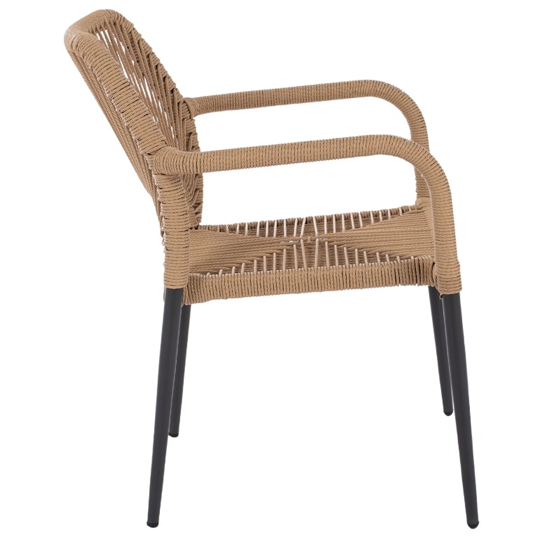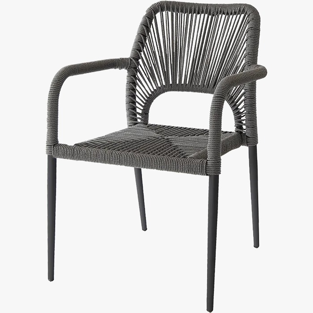 Silla fabricada con estructura de aluminio en color gris o beige, tapizado con cuerda de PE reforzada tejida en el asiento y respaldo, excelente calidad y construcción con tejido artesanal en su asiento.
